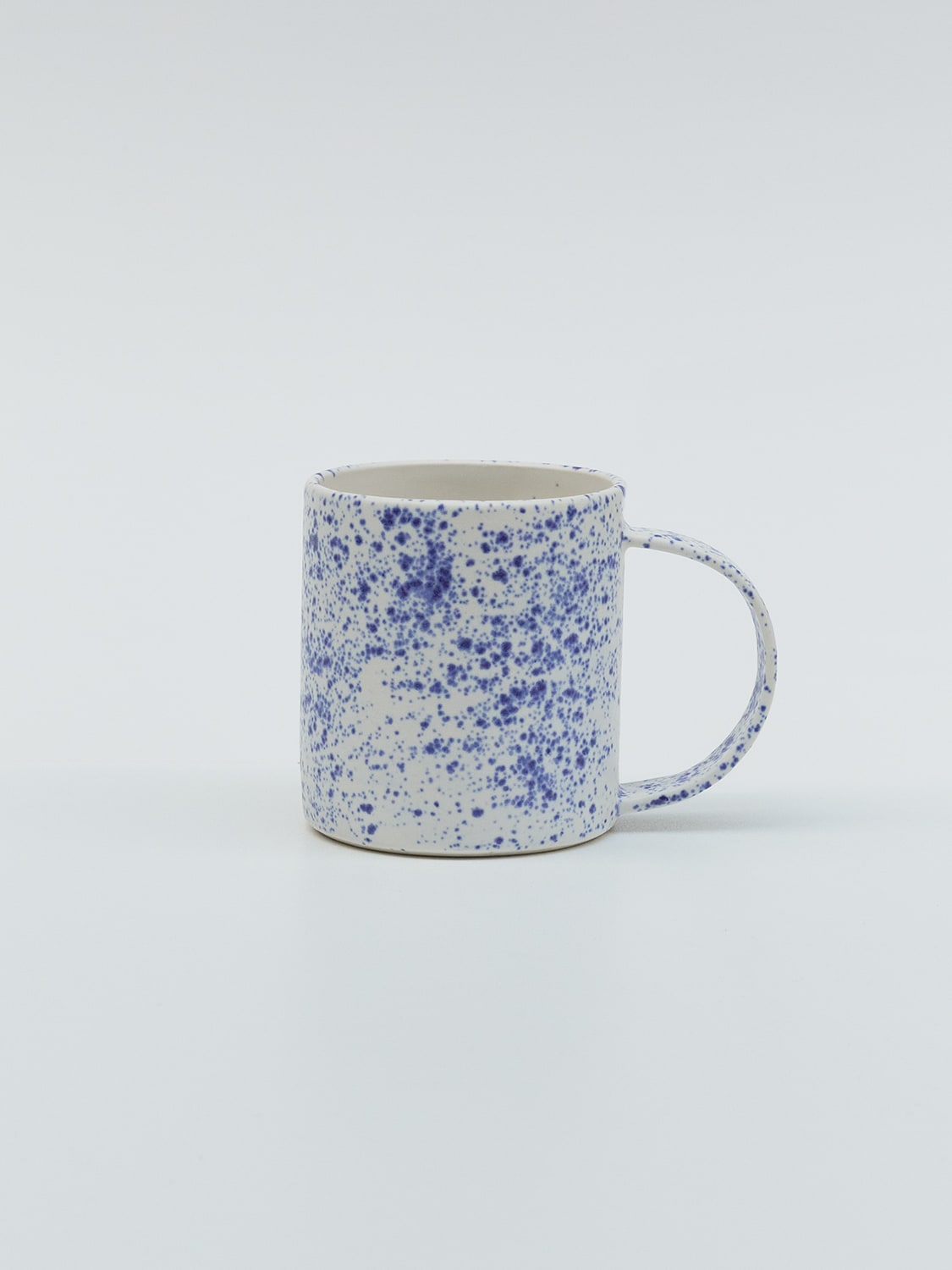 Blue and white splatterware 11oz. stoneware mug handmade in Ann Arbor. Glazed finish. Microwave and dishwasher safe. Exclusive Henri The Potter × ONE DNA collaboration.