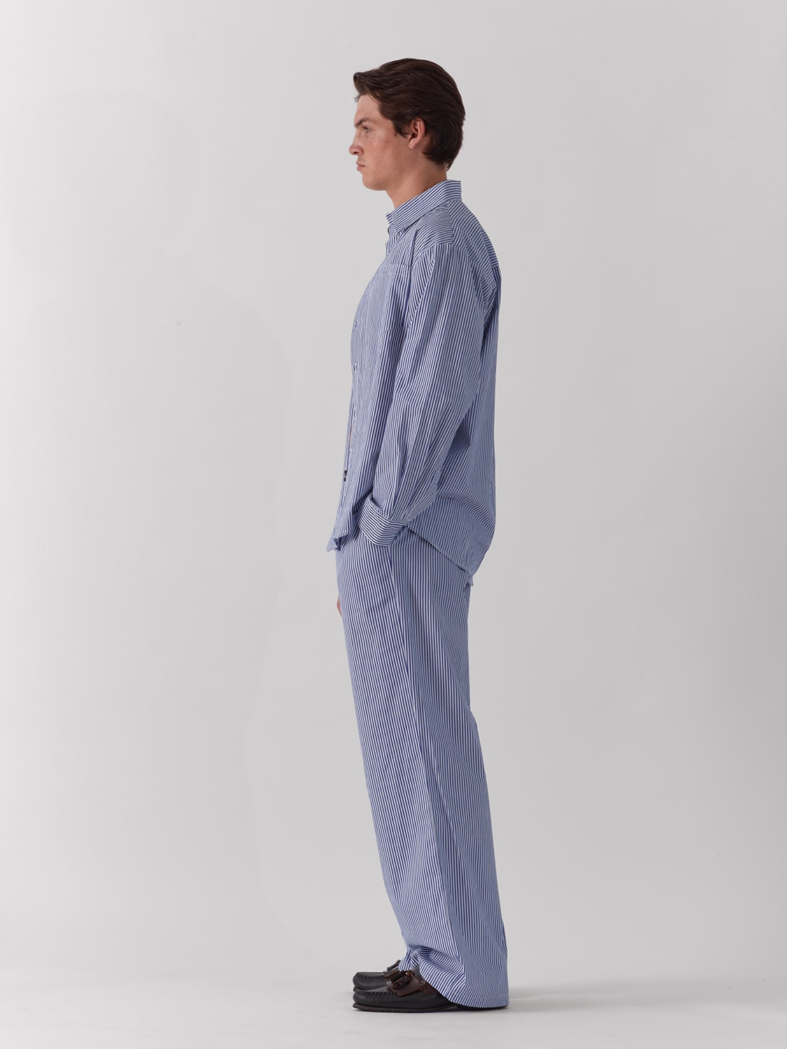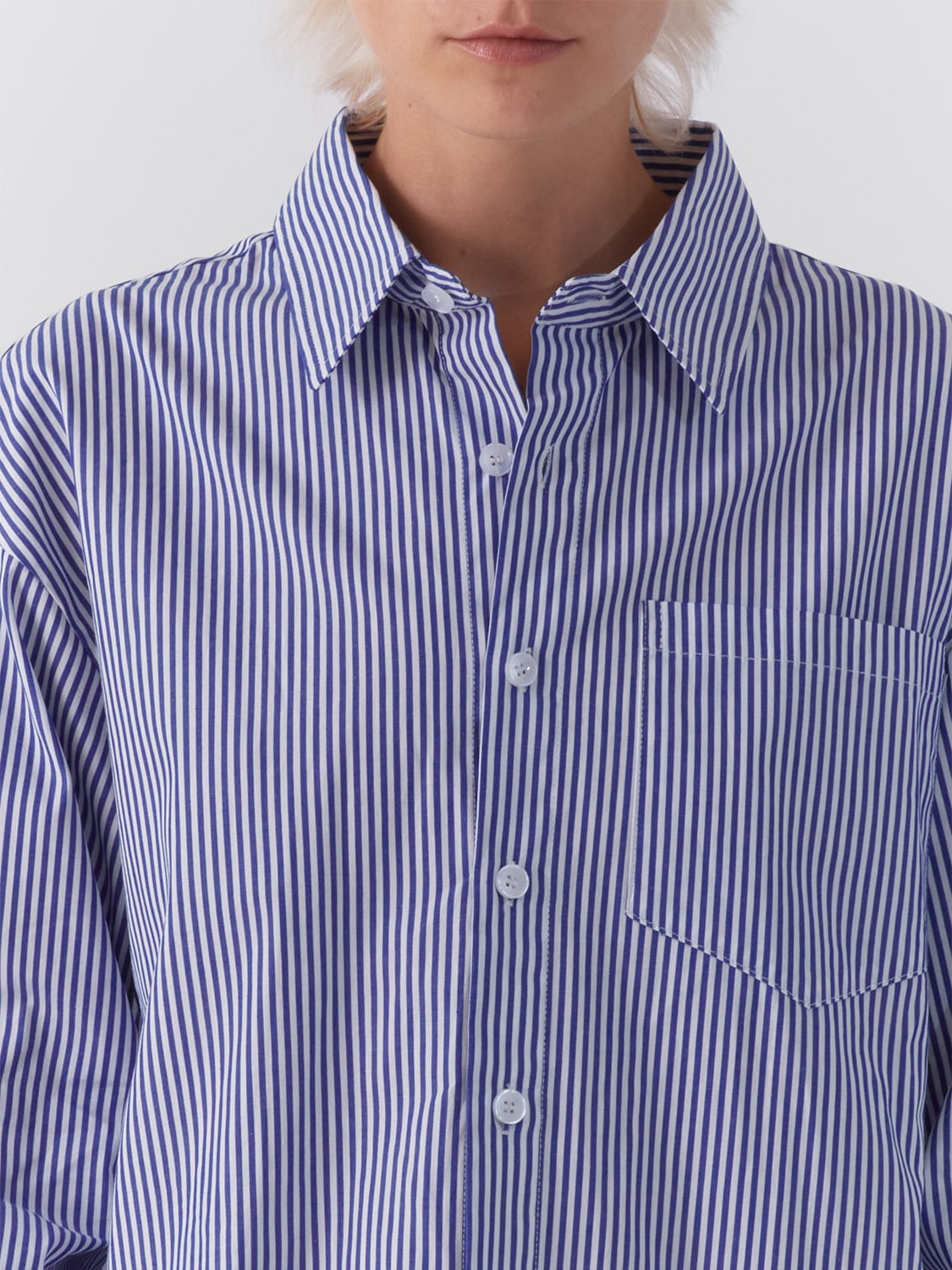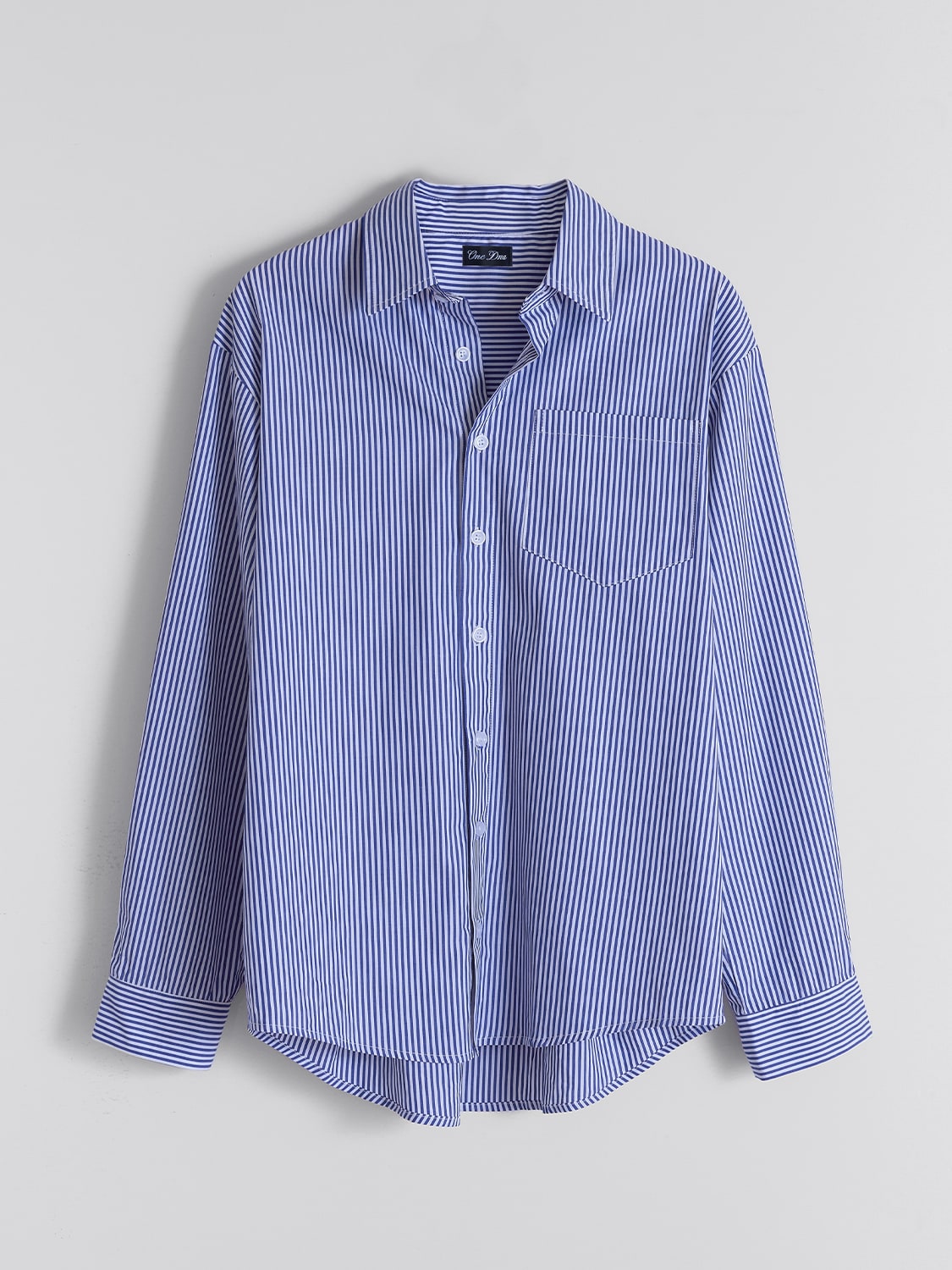 Long sleeve button up shirt in blue and white stripe.