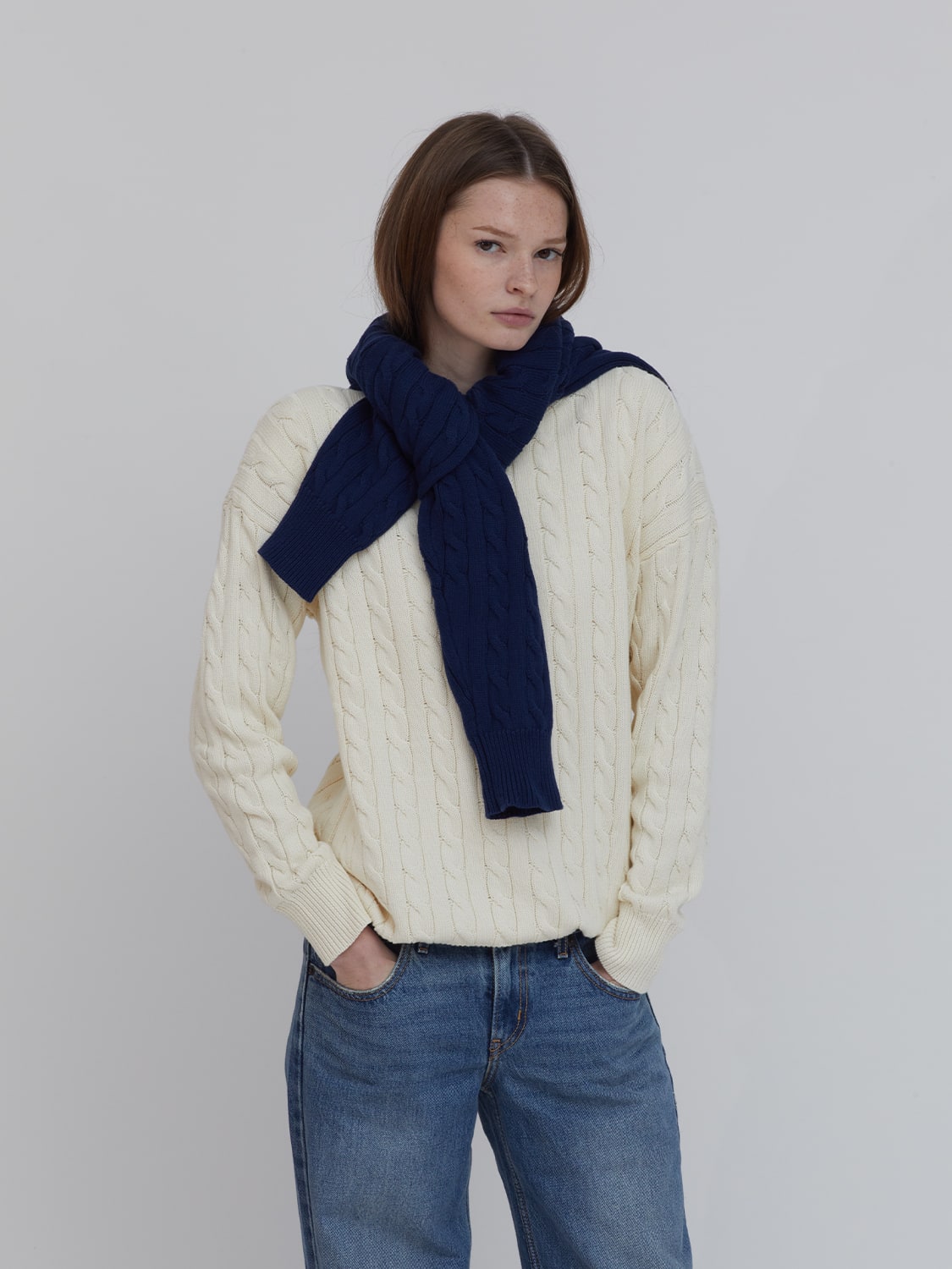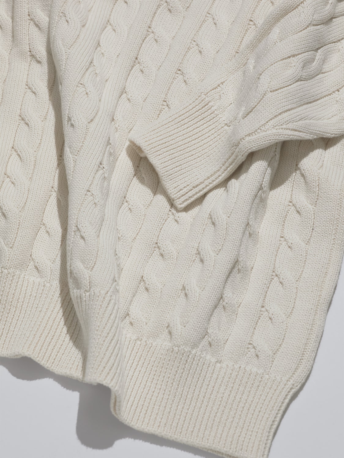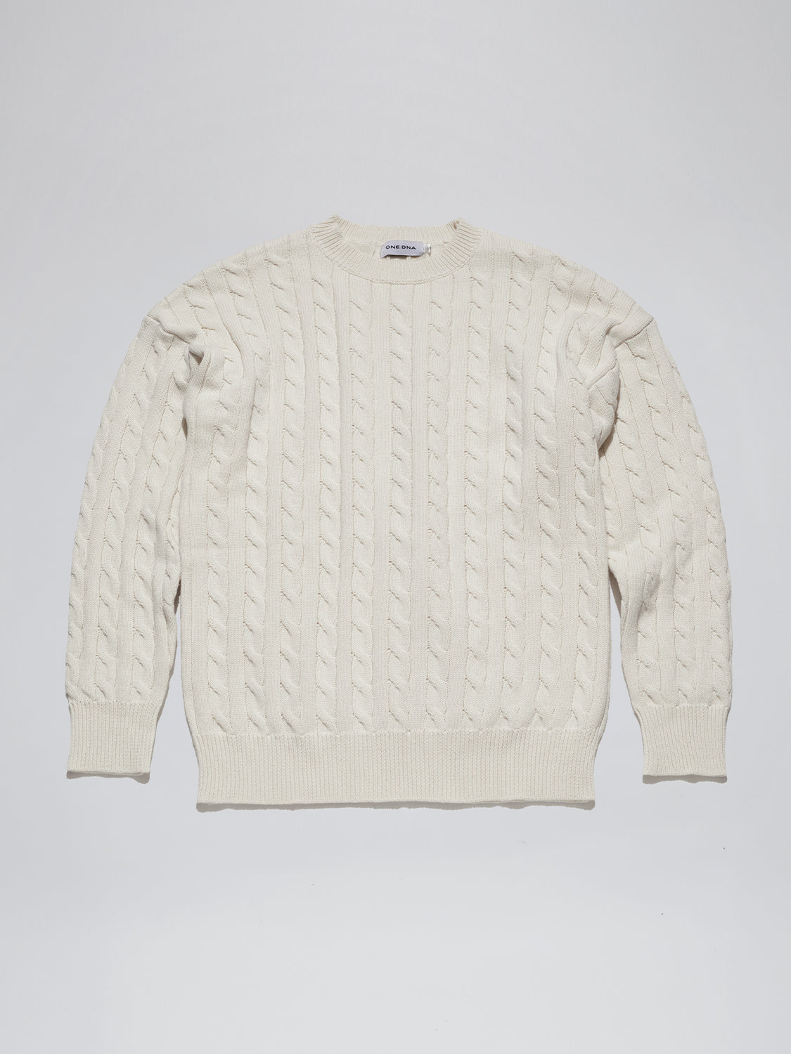 Crewneck cable knit sweater. Medium weight. Breathable. Designed for year-round wear. Ribbed knit neck, cuffs and hem. Classic/timeless. Sophisticated. Relaxed. 100% Cotton.