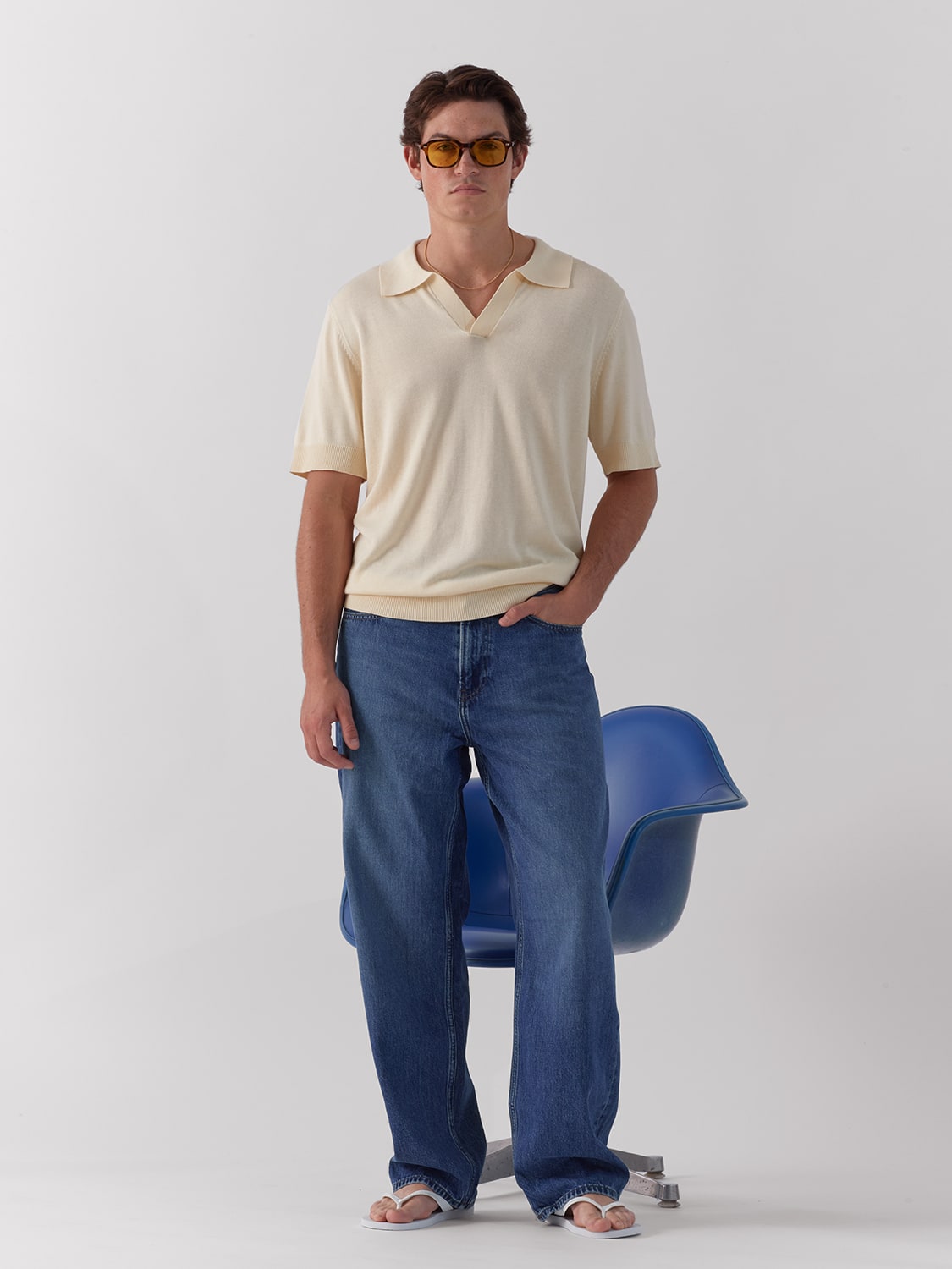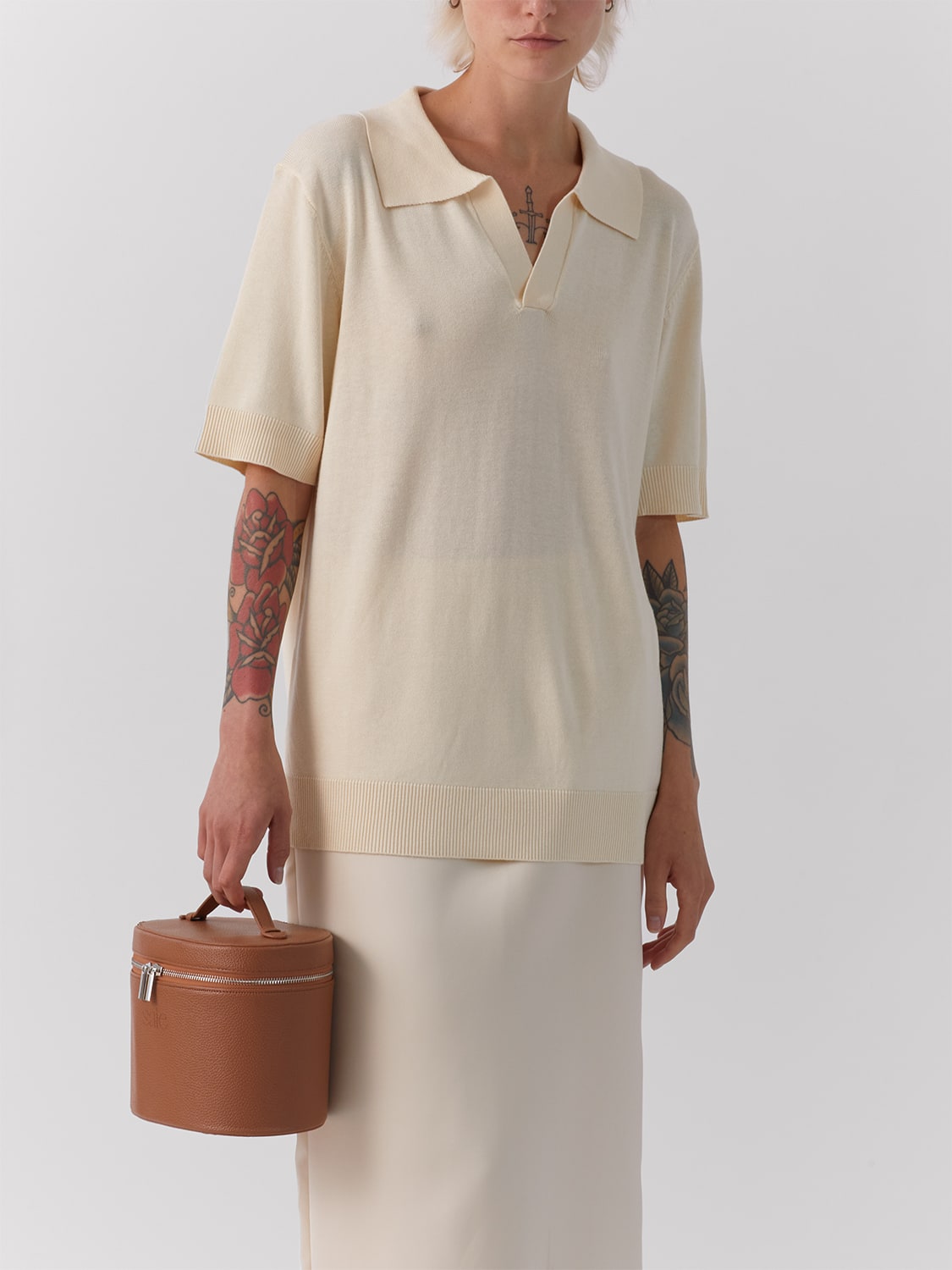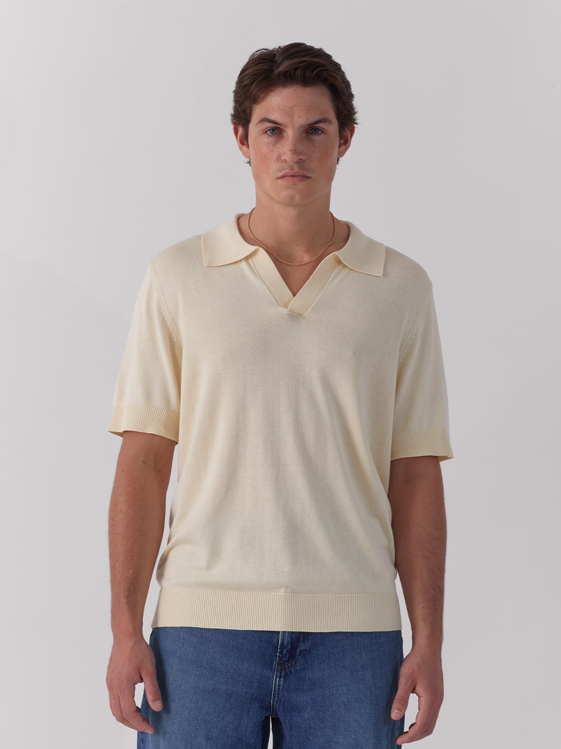Open-collar knitted polo shirt in butter/cream. Rib knit neck, hem, and cuffs. Light to medium weight. Minimal and relaxed. For dressy to casual occasions. 60% Cotton 40% viscose blend is breathable and soft for all-day comfort.