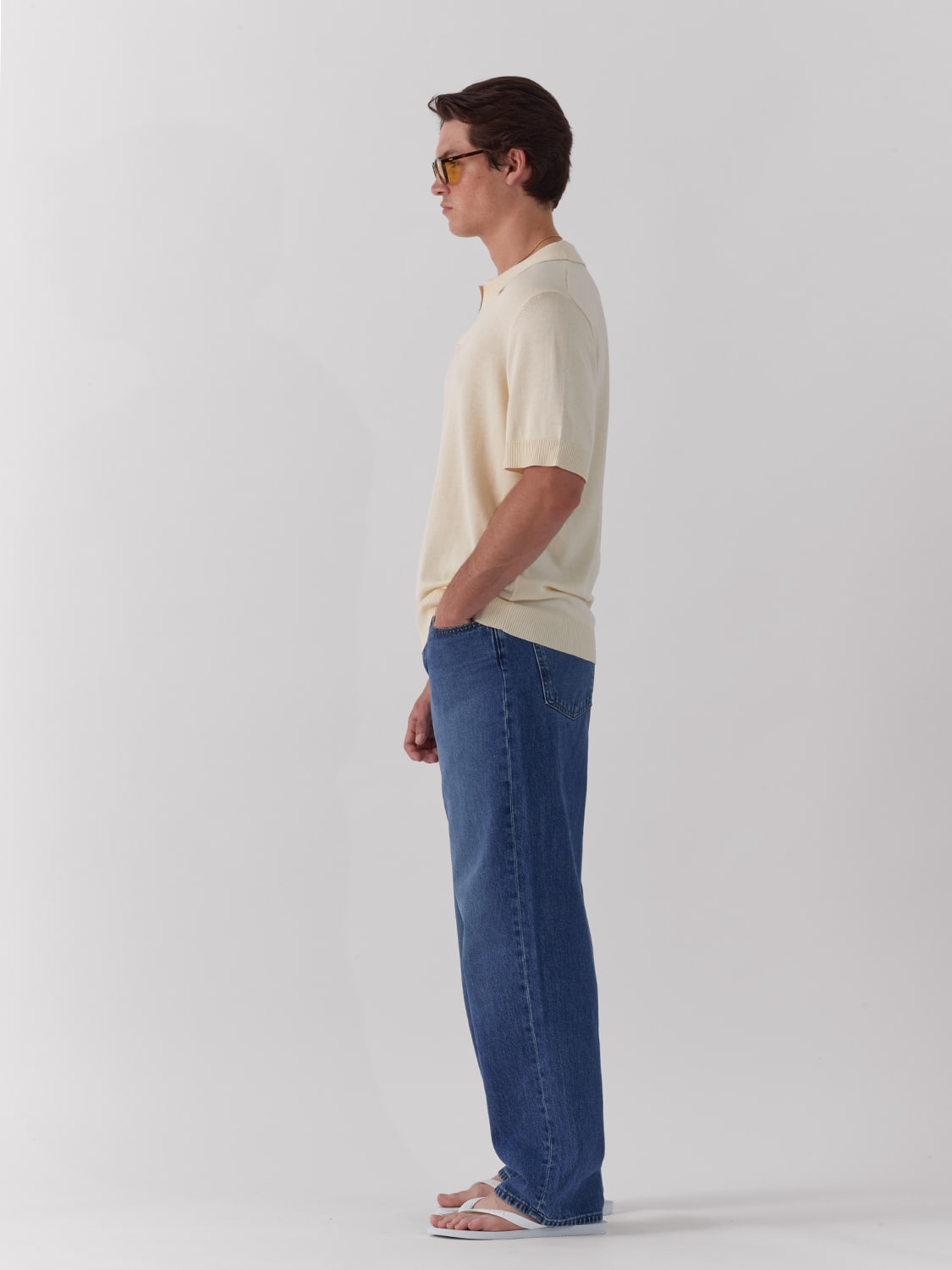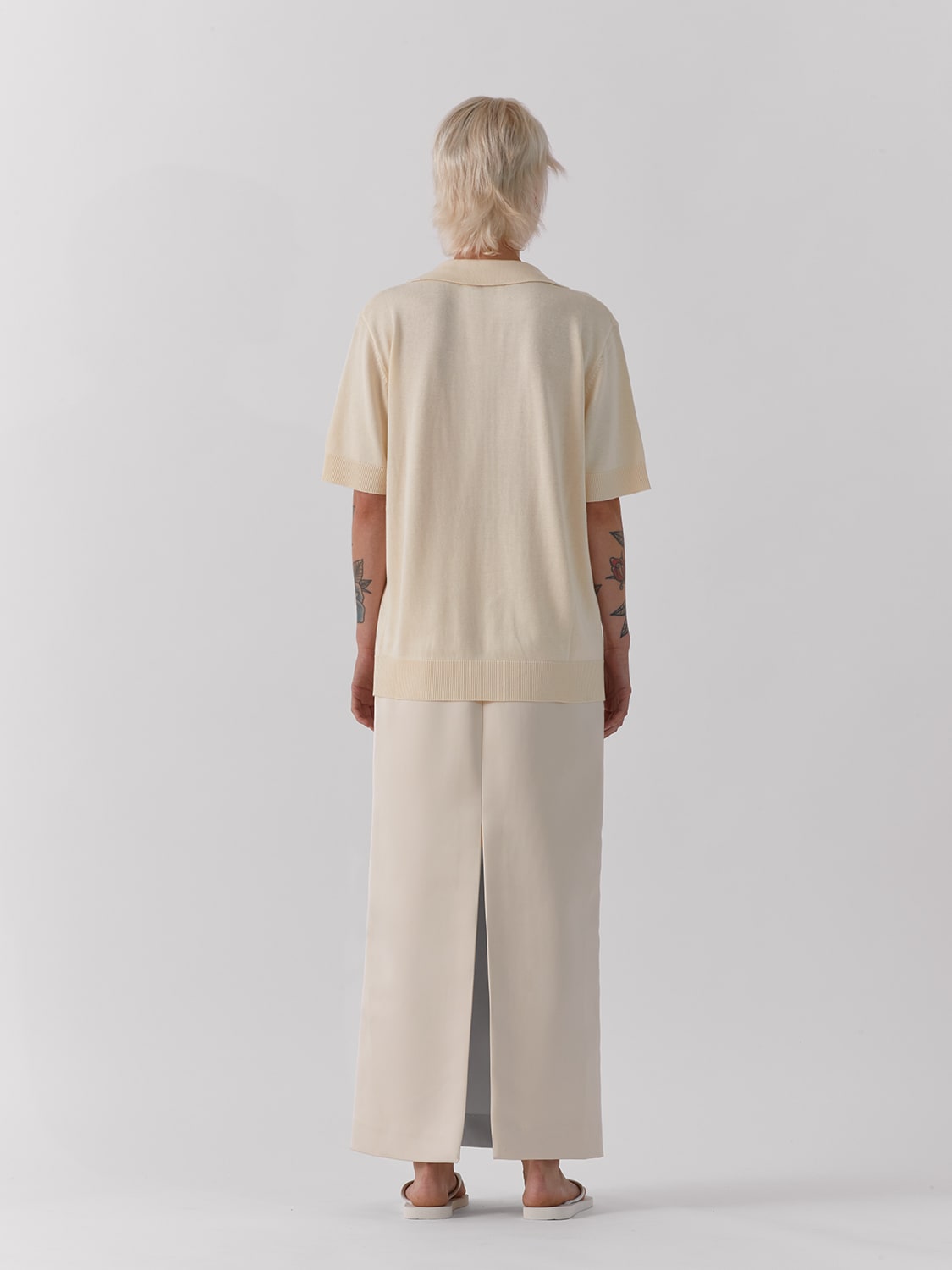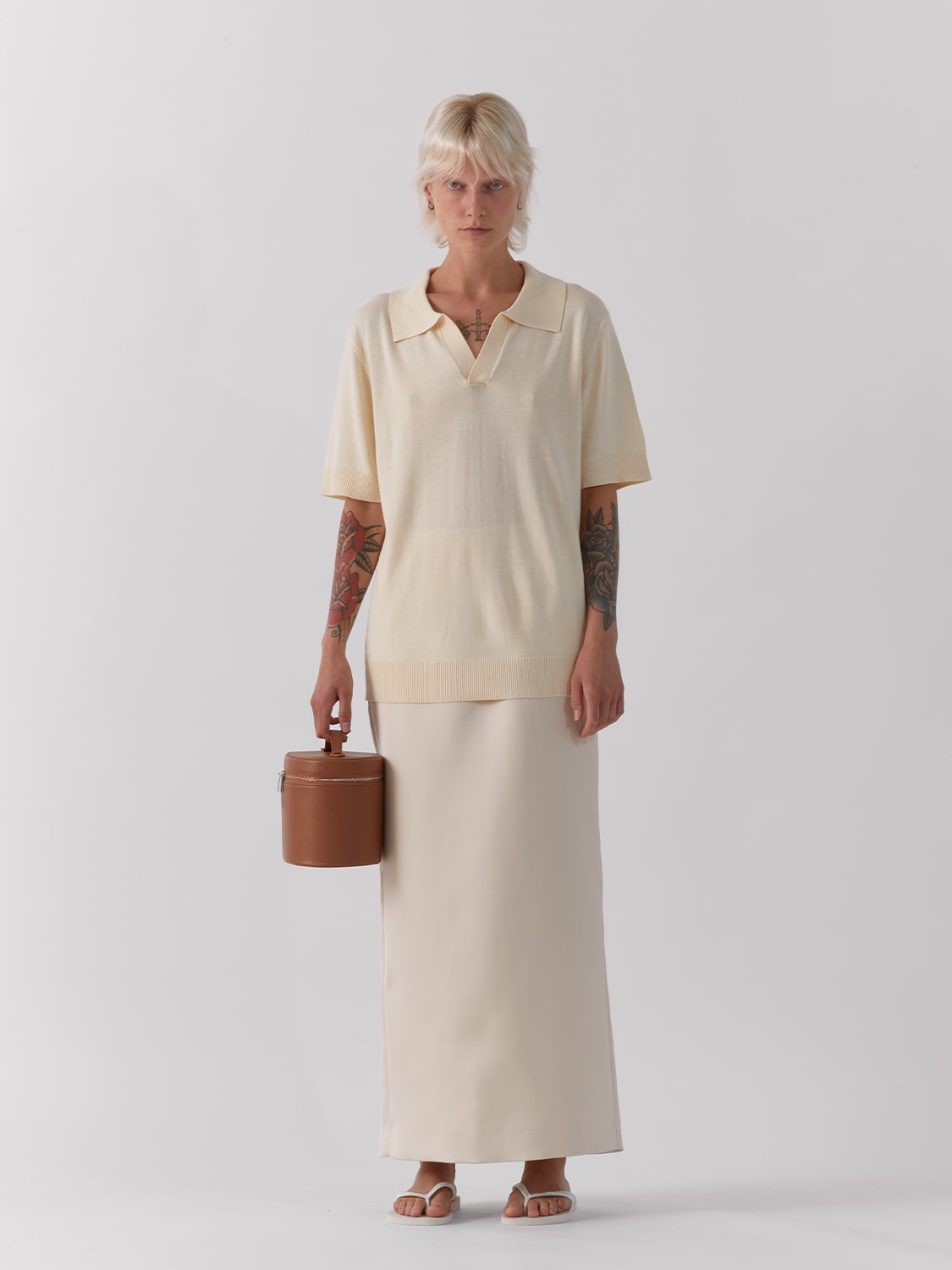 Open-collar knitted polo shirt in butter/cream. Rib knit neck, hem, and cuffs. Light to medium weight. Minimal and relaxed. For dressy to casual occasions. 60% Cotton 40% viscose blend is breathable and soft for all-day comfort.