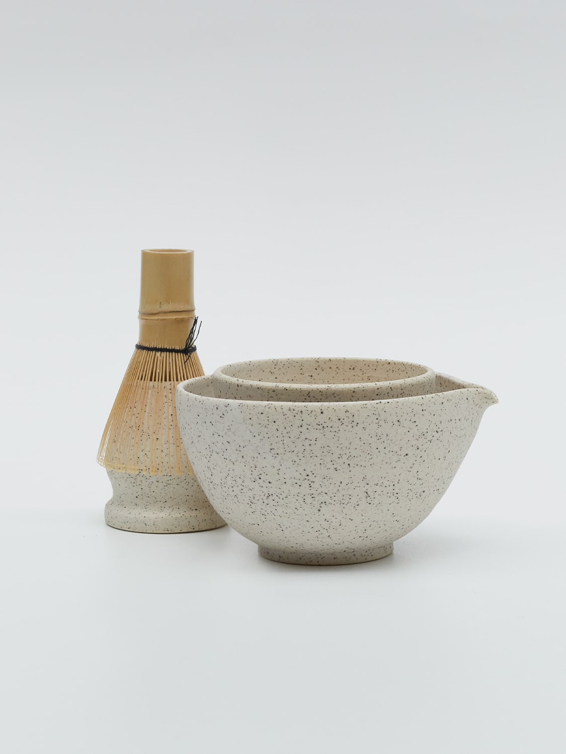 Natural sesame stoneware matcha set. Incudes: mixing bowl; serving cup; whisk and whisk stand; sifter; scoop. Suitable for making ceremonial matcha. Handmade in Ann Arbor. Glazed finish. Microwave and dishwasher safe. Gift box. Exclusive Henri The Potter × ONE DNA collaboration.