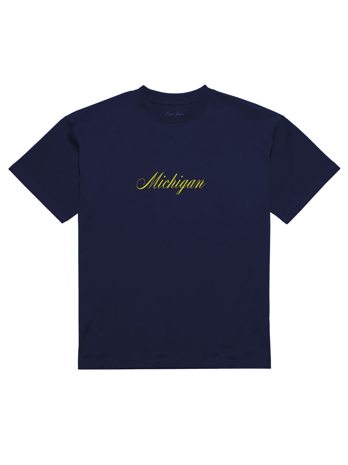 Navy t-shirt with Michigan in cursive font screen printed at front. For every day wear, city strolling, gym, sports and recreation, game days, poolside/beach/lake, layering. Medium weight. Wide ribbed neck. 100% cotton. Wash tested.