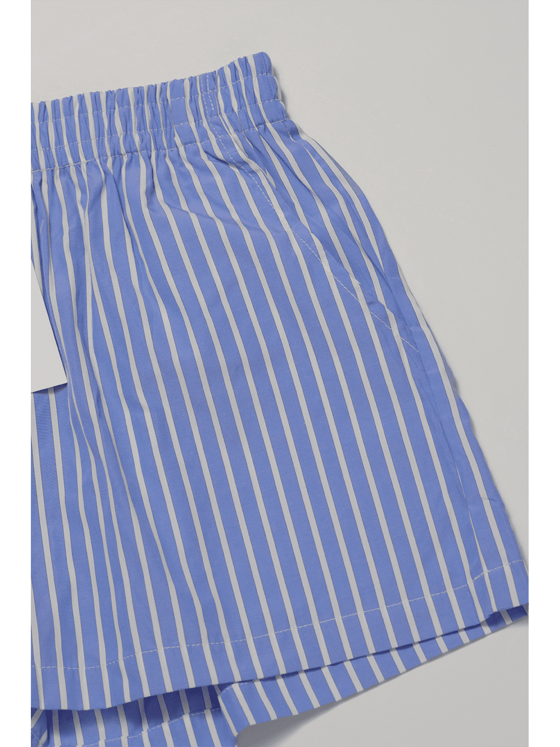 Pinstripe boxer shorts with two side pockets and a back pocket. For beach/lake, travel, around the house, gym/spa/resort. Swim friendly. Minimal. Relaxed. 100% Polyester. Moisture wicking, wrinkle and stain resistant.