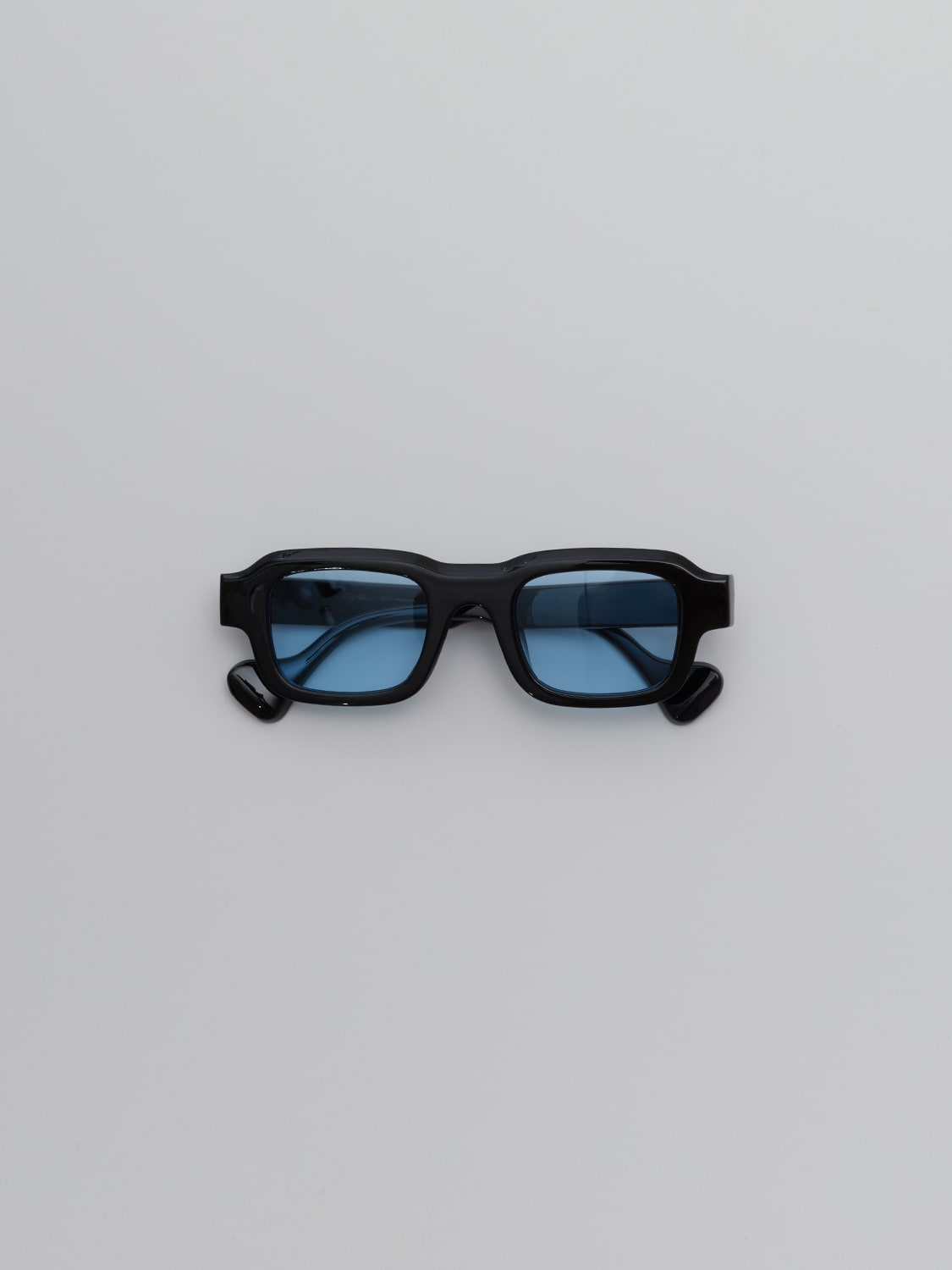 Sunglasses with black rectangular frames and blue lenses.