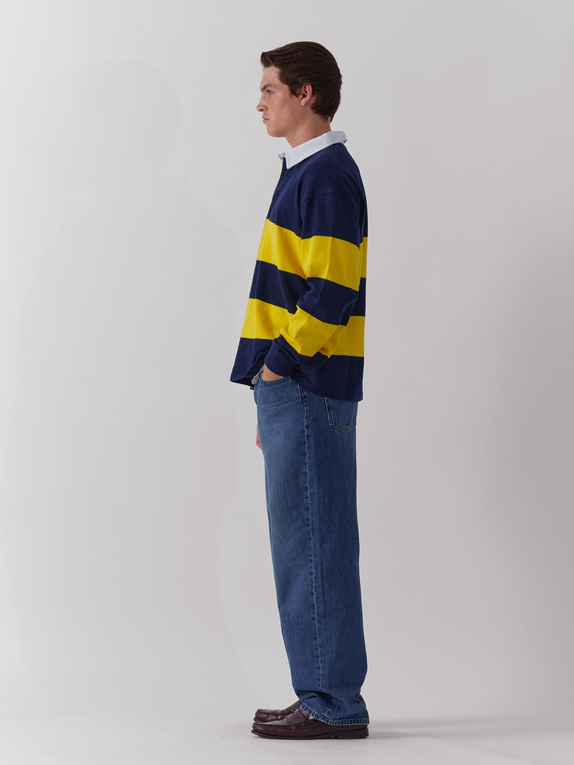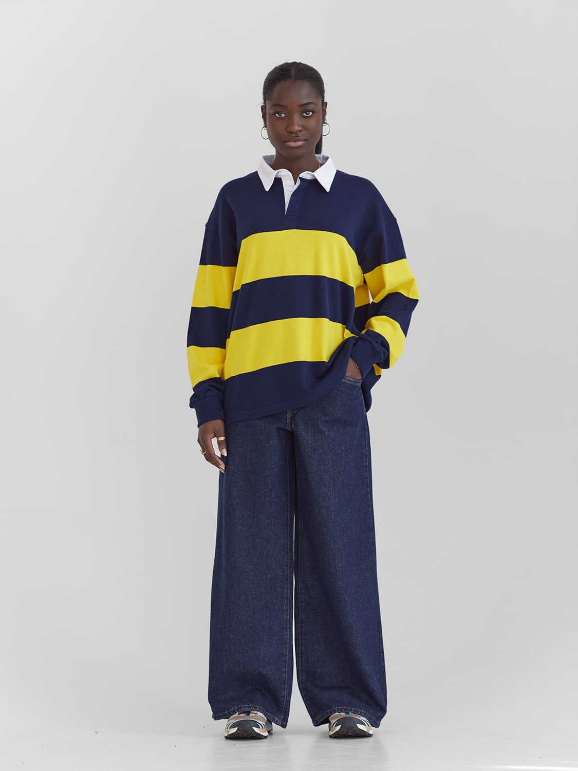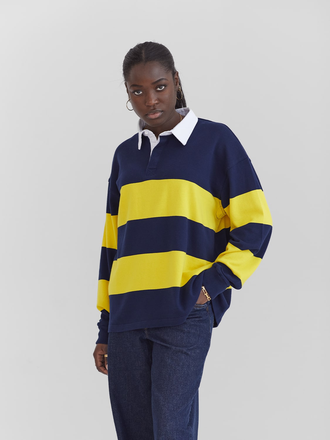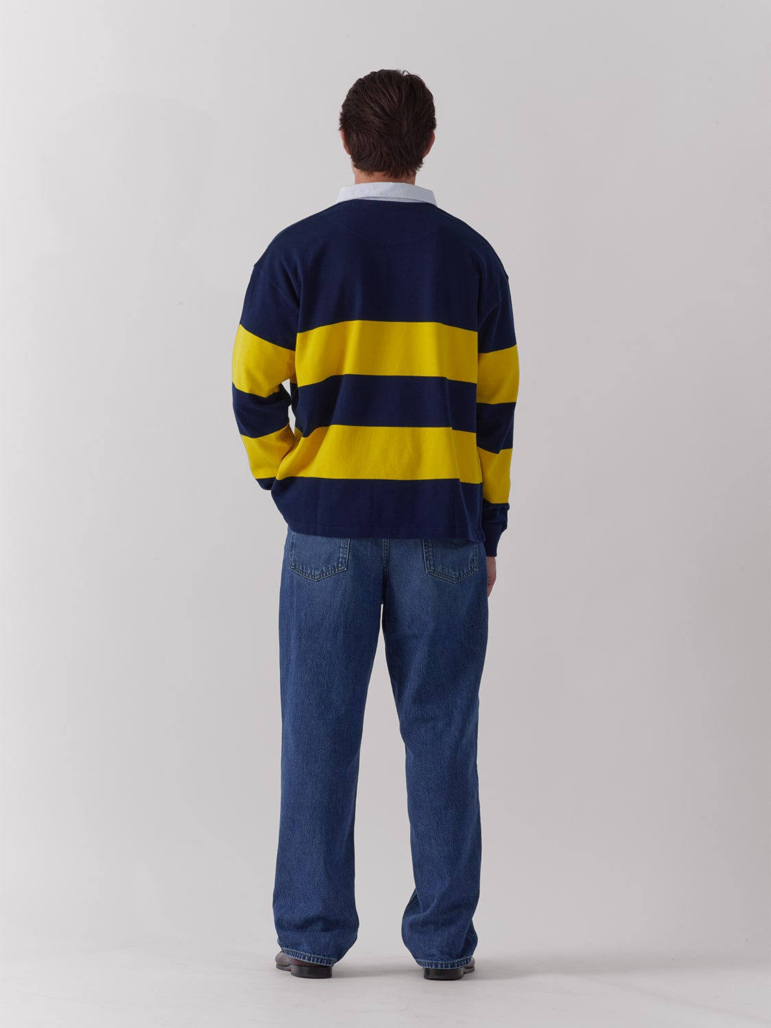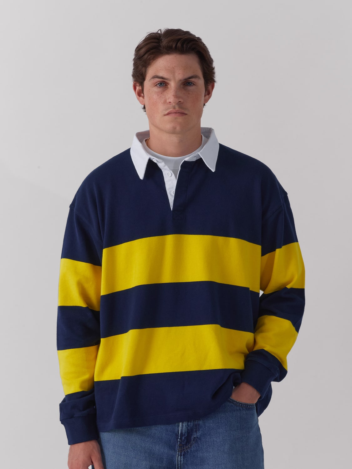 Long sleeve rugby polo in navy and yellow stripes.