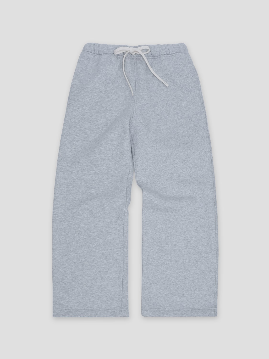 Heather gray wide-leg open-bottom sweatpants. Medium to heavy weight. Ultra cozy. For errands, lounging, gym, sports and recreation, class, travel, everyday wear. Side pockets. Elasticated waistband with drawstring. 52% Cotton 48% polyester. Wrinkle-resistant. Moisture-wicking. Easy to maintain.