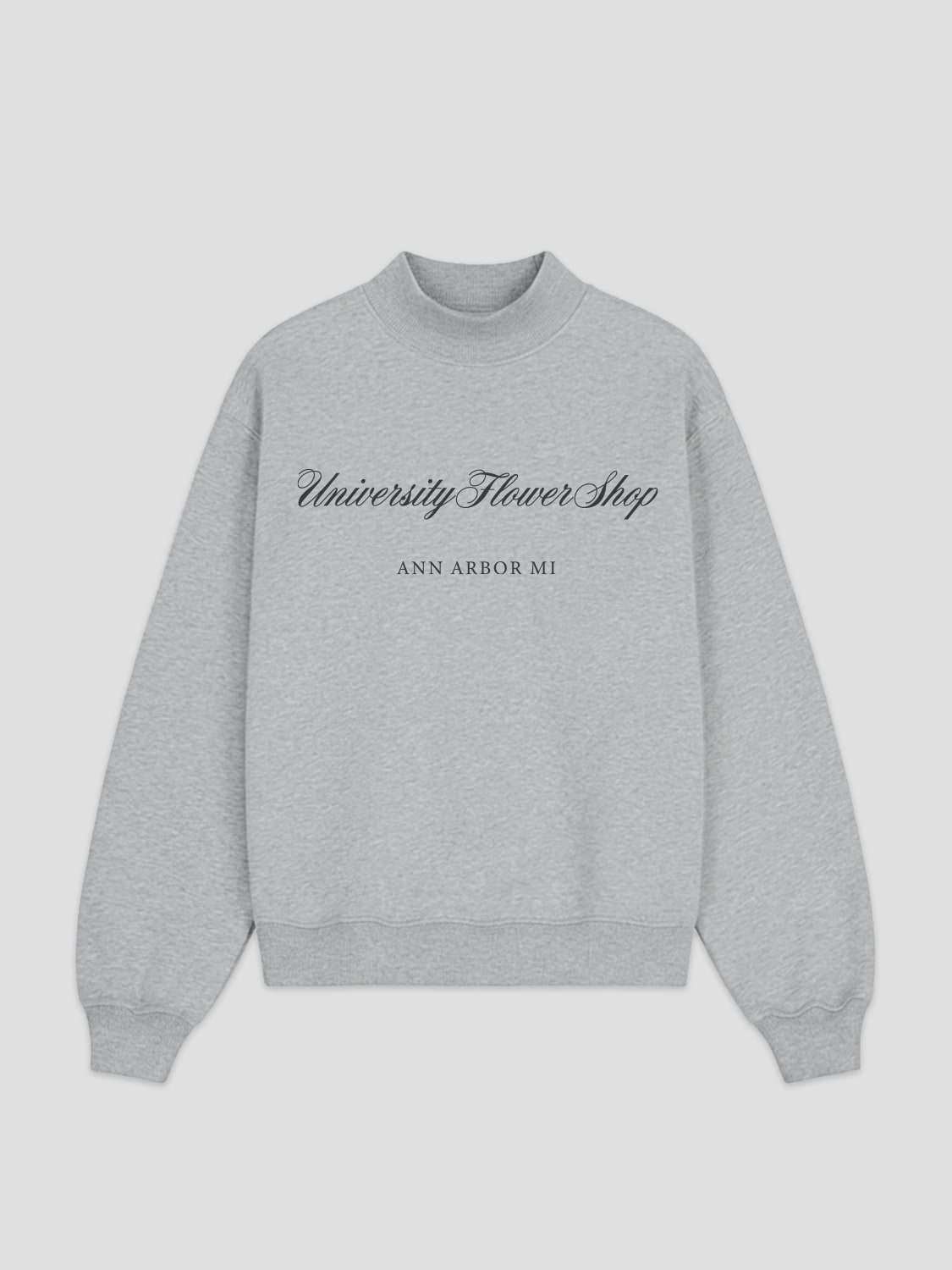 Mock neck sweatshirt in heather gray with University Flower Shop Ann Arbor screen printed at front.  Part of our signature premium fleece series, this heavyweight mockneck sweatshirt is expertly crafted from high-quality jersey fleece for a structured yet soft feel. The minimalist design nods to vintage athleticwear and features a modern stand collar.